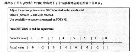 在确保传感器周围80cm内没有其它物体后,观察8个传感器的Actualvalue是不是每个都在-2到2之间,如果在的话,就说明初始输出值正常,传感器不需要调整,键入回车和0可以退出;如果超出这个范围.就进入下一步。 4调整传感器初始输出值 如果8个传感器的Actualvalue不是每个都在-2到2之间,则将L臂的后盖打开,找到SPC5板,可以看到该板上有8个电位器,这8个电位器就分别对应Tube和II上的8个传感器.通过调节电位器的电阻值可以将ActualValue全部调回至-2与2之间,对着上面的初始输出值列表,用平El螺丝刀将它们逐一调回。尤其需要注意的是,在此过程中必须保证传感器周围80cm内没有其它物体.不然此校准过程会不准确。 5校准完成 调整完成后,按下回车键保存数据,再根据VTl00中出现的提示按“0”键多次可退出程序。撤去连接线,盖上L臂后盖和Geometry机柜前盖,重新启动Geometry,即可进入应用模式(ApplicationMode)。 超级终端不仅可以对Bodyguard初始输出值进行调整,也可以监视Intrgris的启动以及各电路板的Self-Test(自检)等等,有兴趣的读者朋友们不妨一试。
