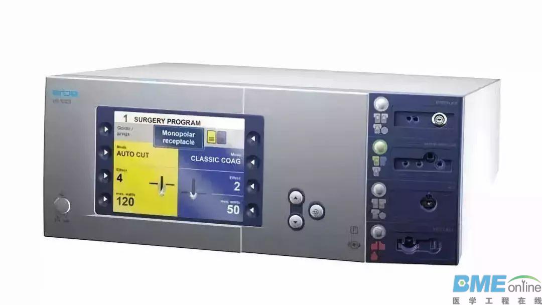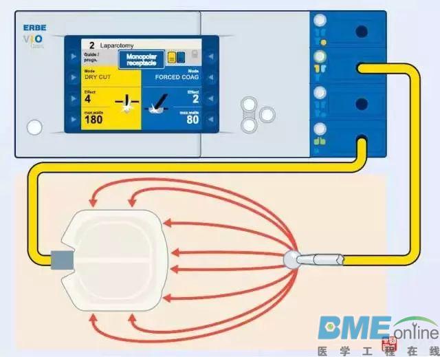 ![]() 单极电刀一般由主机、电刀笔、脚踏控制开关和负极板(线)组成。 2单极电刀的工作原理![]() 利用300~500HZ高频电流,释放的热能和放电对组织进行切割、止血。电流在电刀的刀尖形成高温、热能和放电,使接触的组织快速脱水、分解、蒸发、血液凝固,实现分解组织和凝血作用,达到切割、止血的目的。 3单极电刀的应用范围![]() 单极电刀广泛应用于外科手术,皮肤科、牙科,可按其功能用于不同组织的切割。 (1)纯切割功能:主要用于对任何组织的清晰、精确、无损伤的切割。 (2)混切割功能:用于对任何组织的切割,同时有良好的凝血功能。 (3)凝血功能一般有以下三种: a、低压接触式凝血(desicate/low):一般用于腔镜手术和精细组织凝血。 b、非接触式凝血(fulgurate/med):对大部分组织都有效,适用于大部分的手术。 c、喷射式凝血(spray/high):用于大面积组织渗血,并形成非常浅薄的组织焦荚层。 4操作步骤1.连接电源线,负极板线路。 2.接通电源,开机自检,根据说明书和手术选择合适的输出功率。 3.负极板粘贴于病人肌肉丰富的合适部位。 4.连接电刀笔线路,使用手控或脚控开关。 5.使用完毕先关主机电源,再拨电源插头。 5注意事项1.高频电刀应当由经过培训的医护人员操作,即使在使用新电刀前也应仔细阅读使用说明书,以防误操作引起安全问题。 2.负极板的选择:硬式负极板比软式负极板安全性差,双回路负极板比单回路负极板安全性高,必使用中应注意观察。 ![]() 3.输出功率达到100~700W时,极其容易发生烫伤或干拢其它电子设备。 4.负极板面积:要求大于100c。一般要求儿童负极板有效导电面积是65c.成人的有效导电面积是129c,一但有效接触面积减少,电阻增大至不安全水平时,机器自动报警并停止输出。极板温度超过皮温6℃,可发生灼伤。 ![]() 5.负极板安放部位的选择: ①不合适的部位:骨性隆起、疤痕、皮肤皱褶、脂肪组织或脂肪较厚、表皮、承受重量部位、液体可能积聚的部位、金属移植物或起搏器附近。 ②合适的部位:易于观察的部位、平坦肌肉区、剃除毛发的皮肤、清洁干燥的皮肤,负极板应距ECG电极15以上;尽量接近手术切口部位以减小电流环路,但因首先考虑理想的黏贴部位如:小腿、大腿内外侧、臀部、腰部、背部、腹部、上肢;尽量避免电流环路中通过移植物、起搏器、心电图电极、心脏等部位;负极板的长边与高频电流方向垂直。 ![]() ③婴儿负极板:部位选择大腿、背部、腹部等平坦肌肉区,15以下的小儿应选择婴幼儿负极板。 ![]() 6.一次性软性负极板的使用注意事项: ①应保持平整,禁止切割和折叠。 ②一次性使用,禁止重复使用:因为使用之后,负极板表面的导电胶粘附了皮屑、毛发后,其理化性能发生变化、导电不良、安全性能降低,病人发生灼伤的可能性增加。同时使用后的负极板可能带有细菌、HIV、HBV等或皮肤病病人的皮屑,同一负极板在不同病人之间反复使用可能发生交叉感染。 ③揭除负极板时应从边缘沿皮纹方向缓慢揭除,避免速度过快,用力过猛,造成机械性损伤。 7.使用过程注意:及时清除电刀头上的焦痂,保持良好的传导功能,禁止用锐器刮擦电刀头表面,应用专门的电刀擦或者湿润的盐水纱布擦除;暂时不用的电刀时,应将其放入绝缘容器内,勿放置在妨碍医生操作的部位及病人暴露的体表,避免引起医务人员及病人的灼伤。 8.安装心脏起搏器的患者禁止使用高频单极电刀。 9.使用过程中避免患者的肢体直接与金属接触,患者与金属床之间至少要保持4厘米厚度的绝缘层,必要时可用布类、手托板固定肢体。 10.电刀笔为一次性使用物品,用后销毁。