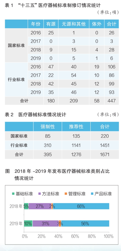 截至2019年底,“十三五”规划中500项医疗器械标准制修订任务已立项447项,已完成89.4%(见表1)。2019年,共发布国家标准5项、行业标准72项以及行业标准修改单3项,医疗器械标准共计1671项(见表2),医疗器械标准技术体系持续优化。