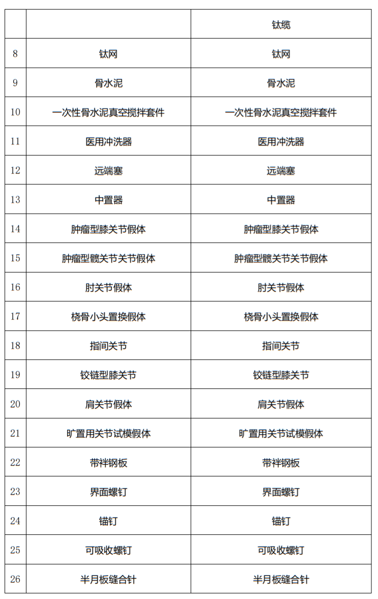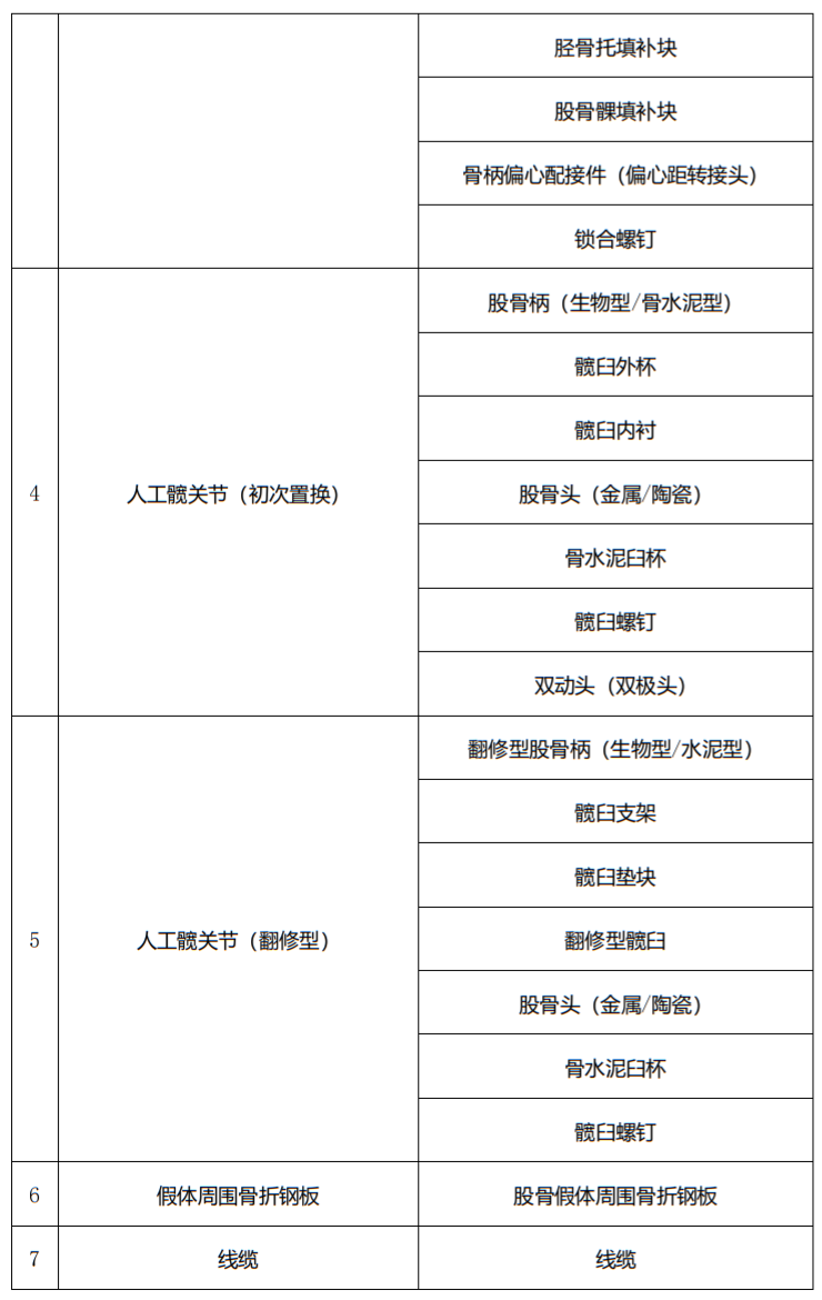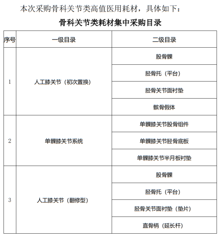 具体涉及人工膝关节、单髁膝关节系统、人工髋关节、假体周围骨折钢板、一次性骨水泥真空搅拌套件等29大类54个品种的骨科耗材。